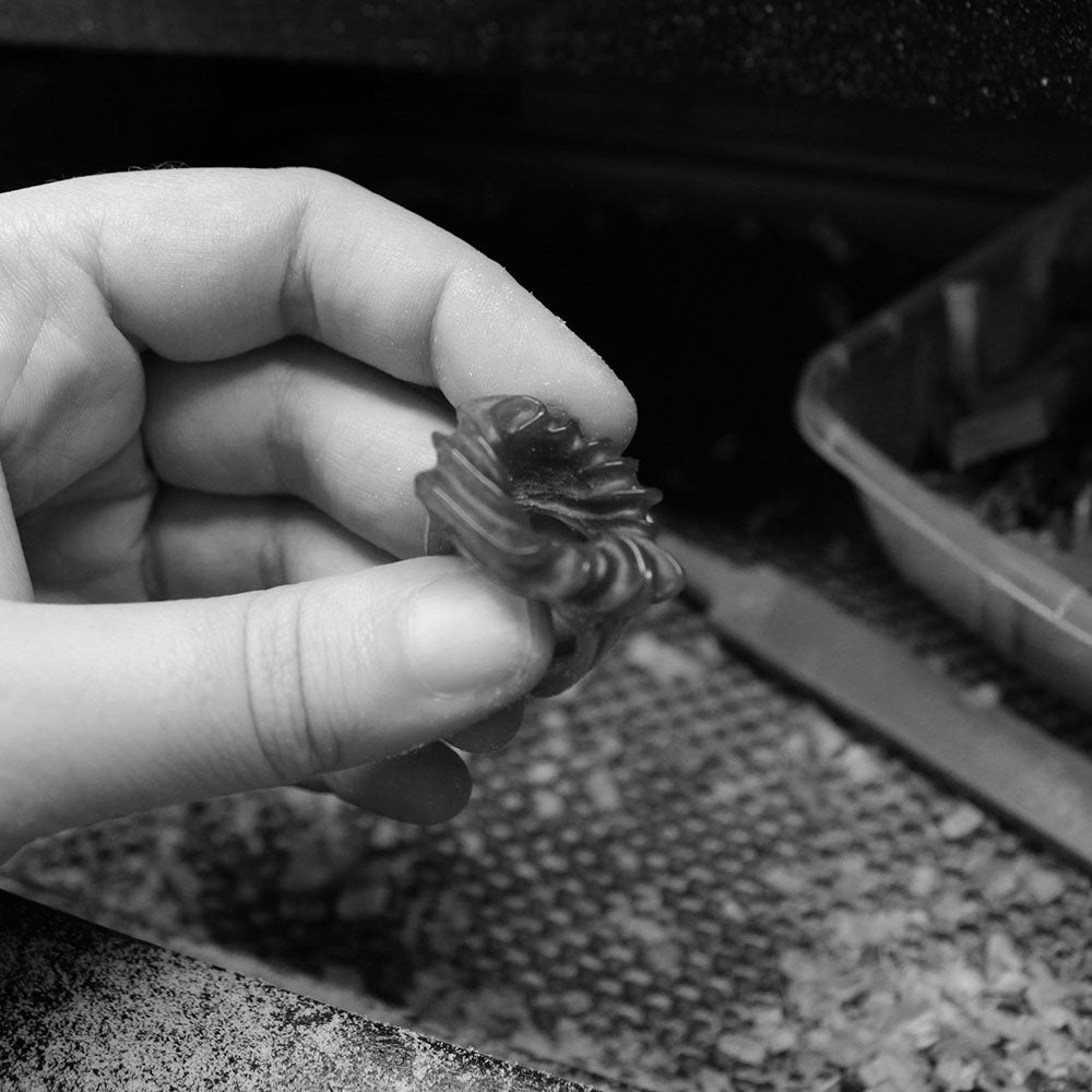 Realizzati interamente a mano, i pezzi vengono scolpiti in cera e quindi fusi con la tecnica della fusione a cera persa, un processo che permette di preservare ogni dettaglio della forma originaria, quindi lavorati e rifiniti.