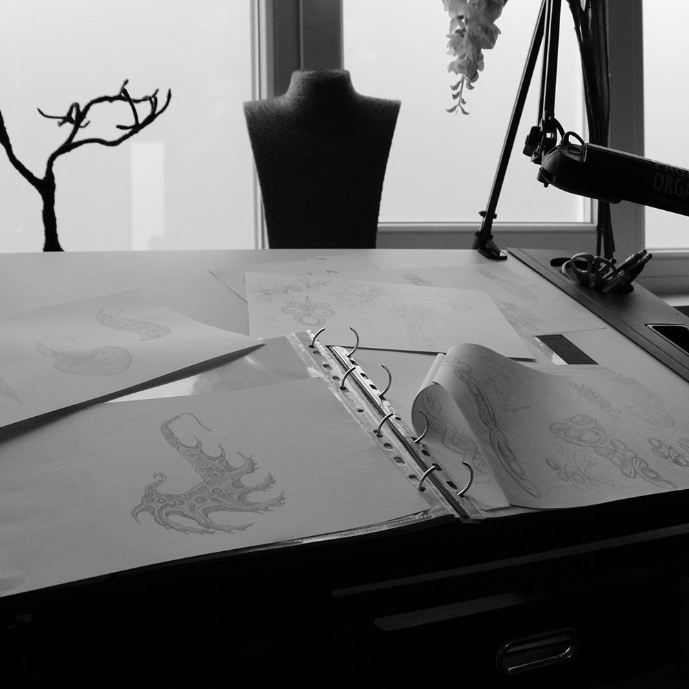 I gioielli RAW vengono prima di tutto immaginati al tavolo da disegno, dove le idee vengono elaborate, trasformandosi in pezzi e collezioni.